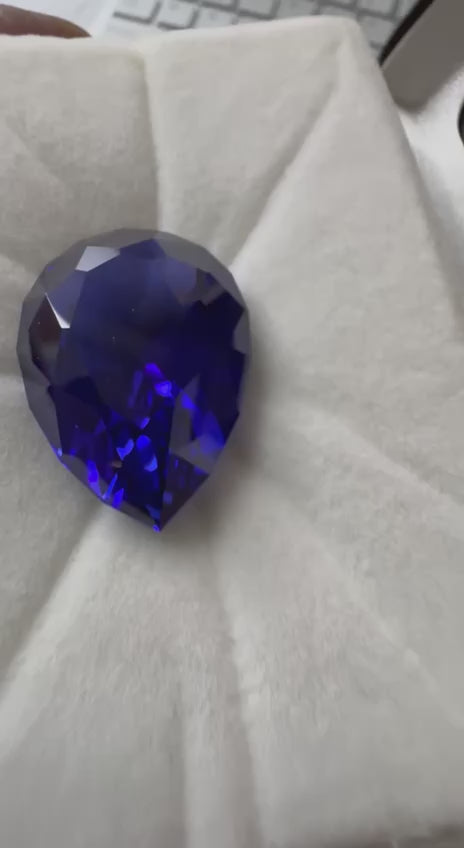 This pair of 41.920 carat pear cut deep violet blue was found in Tanzania. Purchased directly from local dealers and cut in Tanzania by Maria. Tanzanite has a hardness of 6.5-7 on the Mohs hardness scale. Tanzanite is increasingly rare and the price continues to increase because of the supply is continuing to decrease.